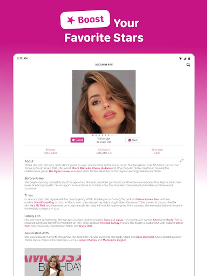 Browse top birthdays and profiles daily, learning about their rise to fame, key milestones, and notable associations.