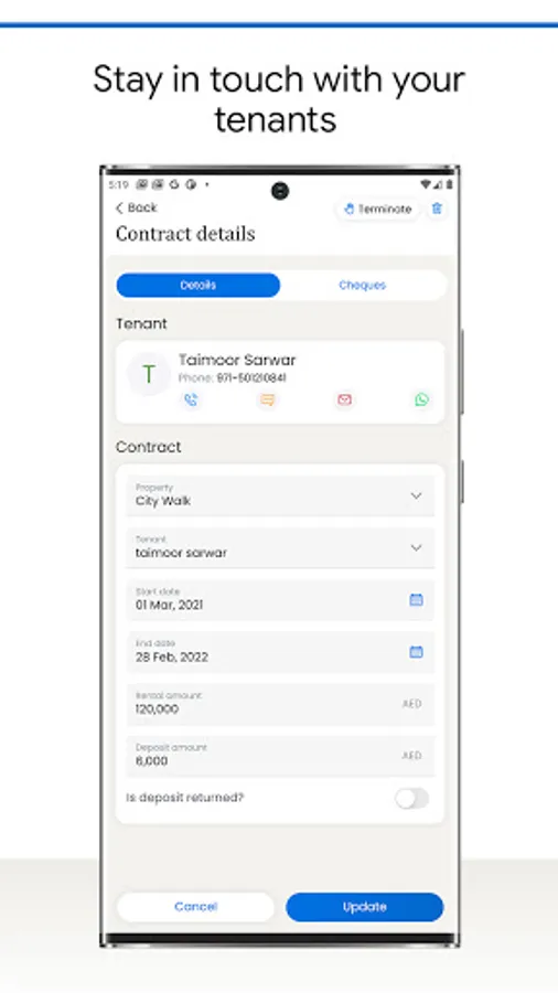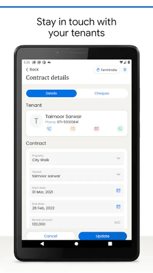 Manage tenancy contracts to properties, their tenants and cheques.