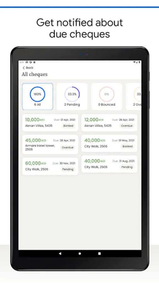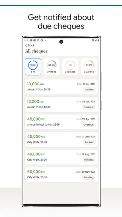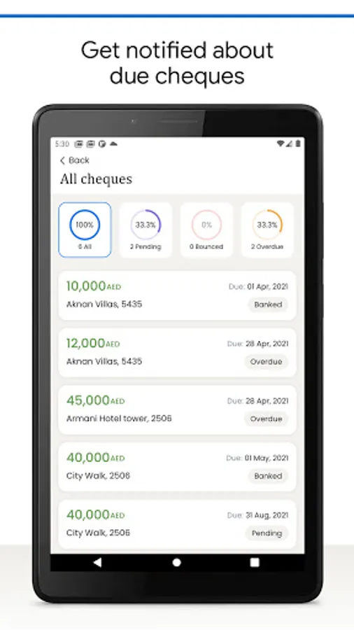 Stay up to date with banked and overdue cheque status.