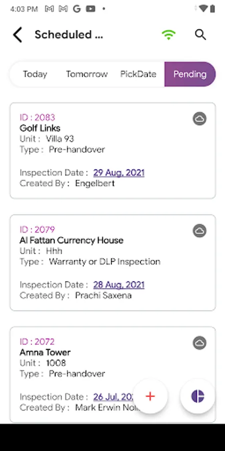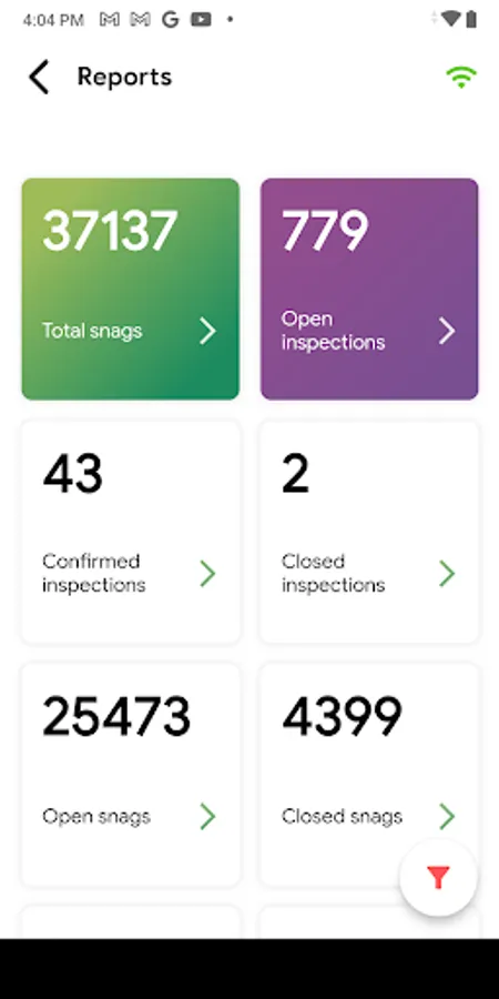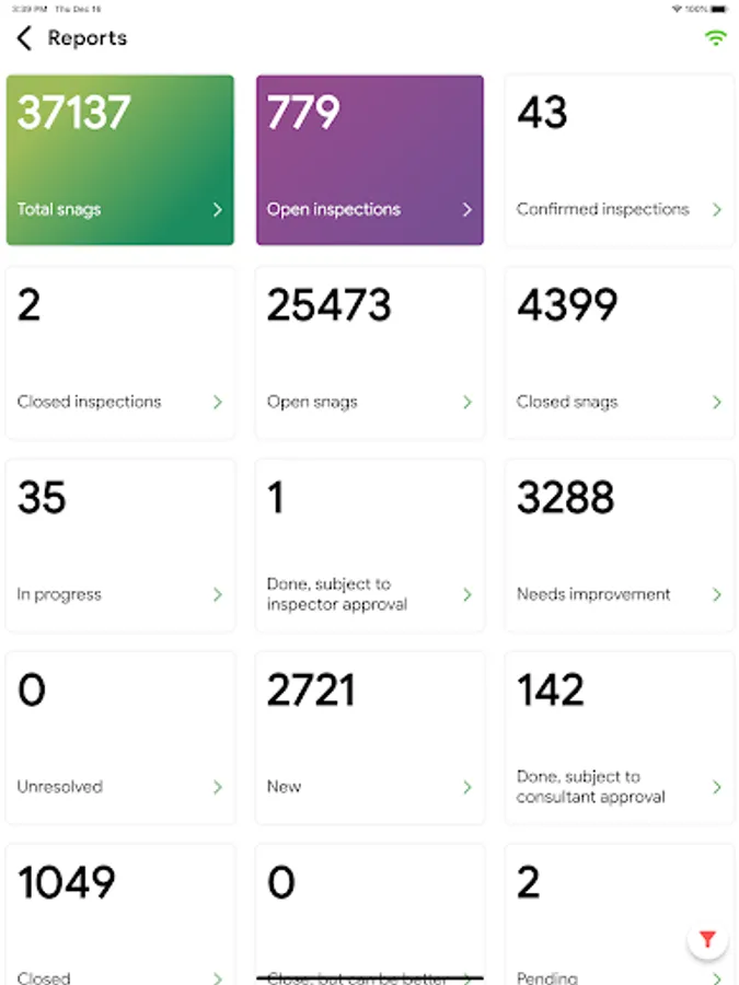 real-time snag reports indicating the type of property, snag incidents, and items, photos, as well