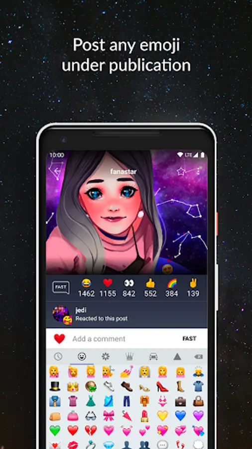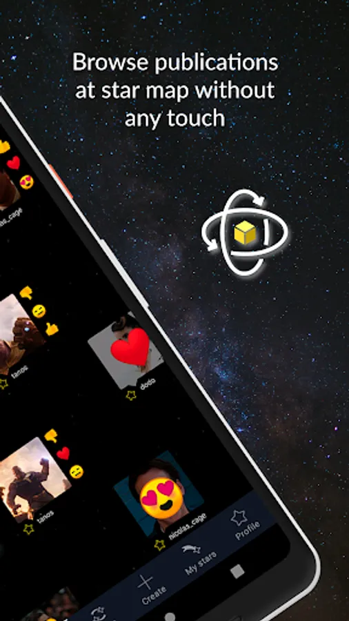 You can create publications and share images with all users to become even more popular. Browse all publications as a star map, without any touch. Just rotate your phone and browse as many star posts as possible. You can leave any emoji under publication - do not limit yourself to hearts and thumbs up as in other social networks apps. The keyboard with many emojis has been created for you!