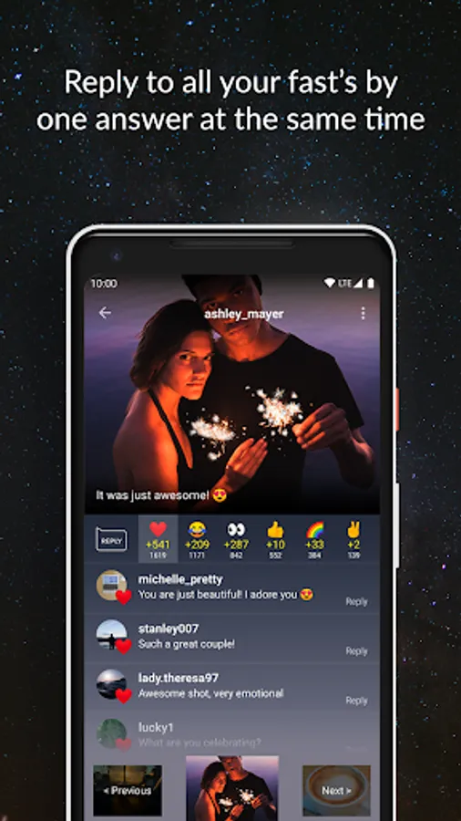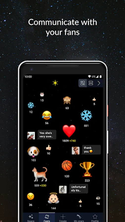 Find new friends in Fanastar social media-subscribe to them and create your own starry sky together. All your friends are your stars and fans now. The more fans you have, the brighter your starshining is. The more publications and fast’s you have, the bigger your star becomes.