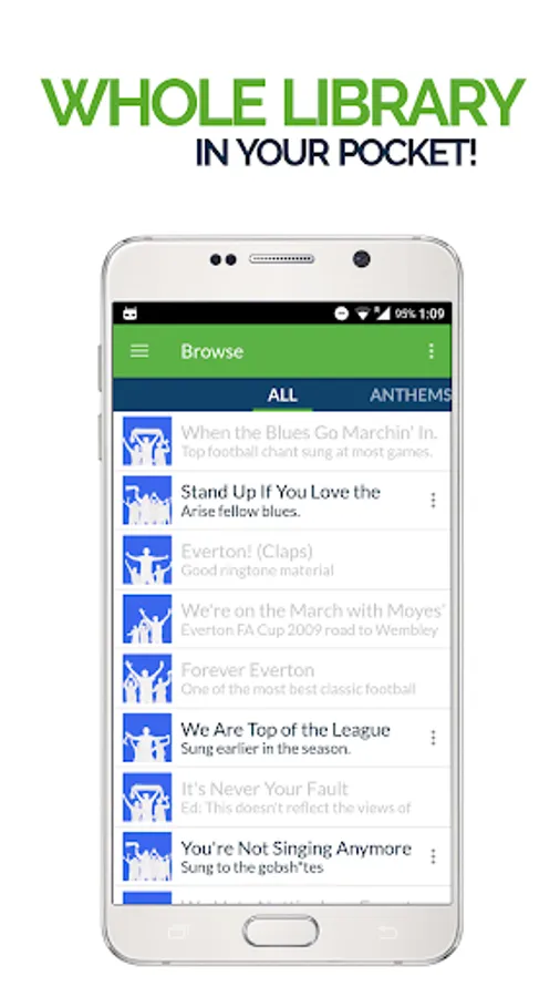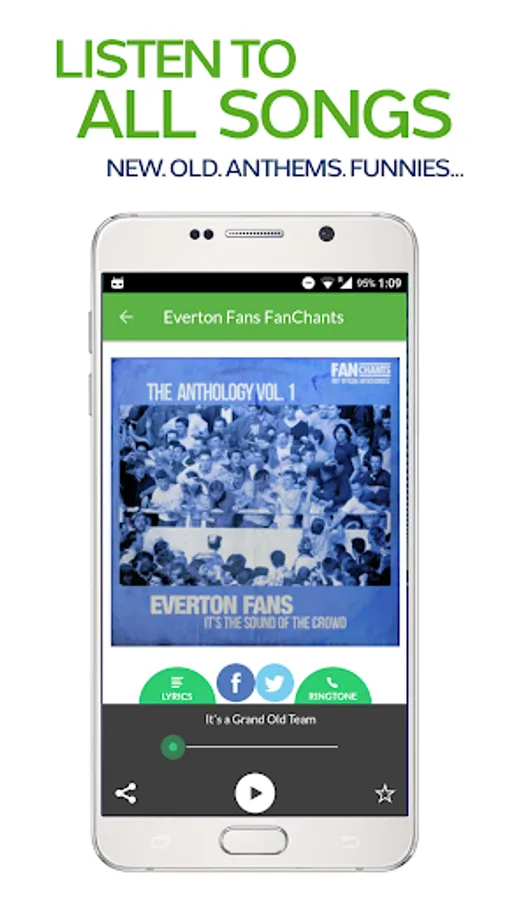 Real Everton Fans football songs to play through speakers, send to mates and use as soccer ringtones for your smartphone. Receive alerts for new Everton Fans chants and use the in-built recording feature to submit new FanChants.