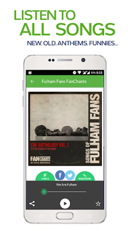 Real Fulham Fans football songs to play through speakers, send to mates and use as soccer ringtones for your smartphone. Receive alerts for new Fulham Fans chants and use the in-built recording feature to submit new FanChants.