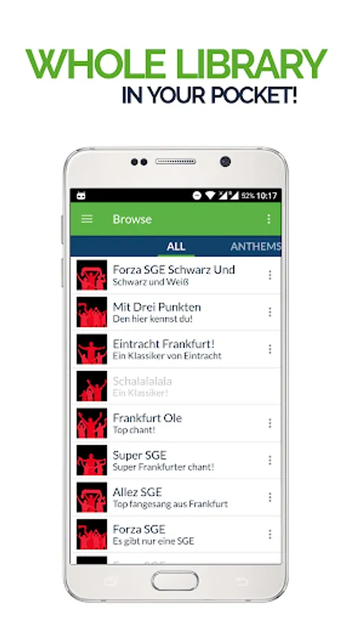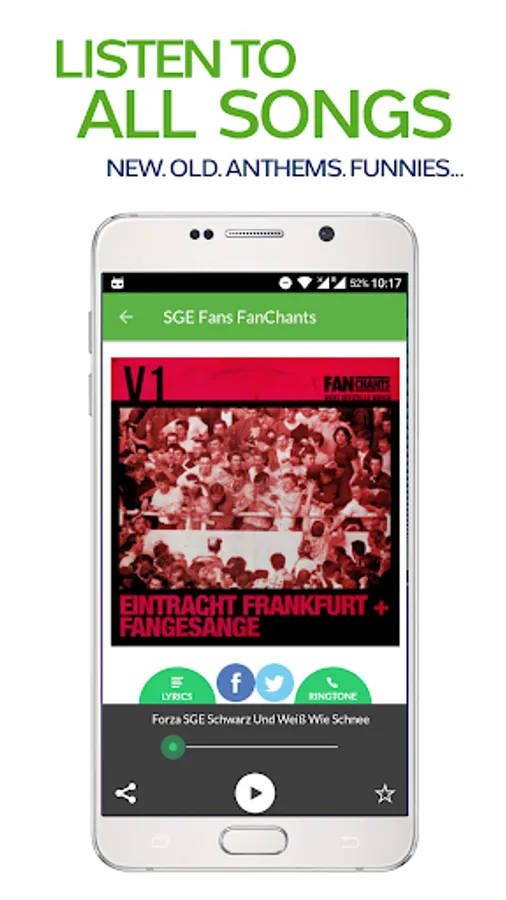 Real E. Frankfurt Fans football songs to play through speakers, send to mates and use as soccer ringtones for your smartphone. Receive alerts for new Eintracht Fans chants and use the in-built recording feature to submit new FanChants.