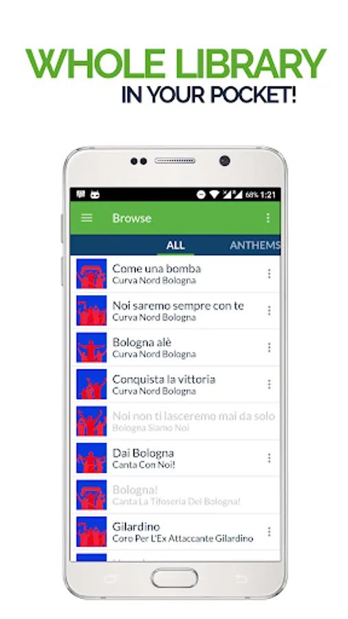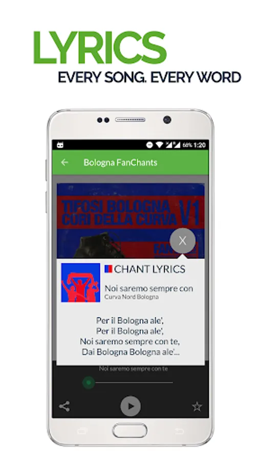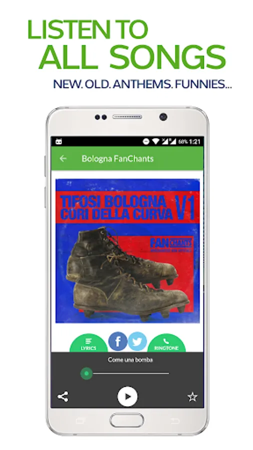 Real Bologna Fans football songs to play through speakers, send to mates and use as soccer ringtones for your smartphone. Receive alerts for new Bolognesi Fans chants and use the in-built recording feature to submit new FanChants.