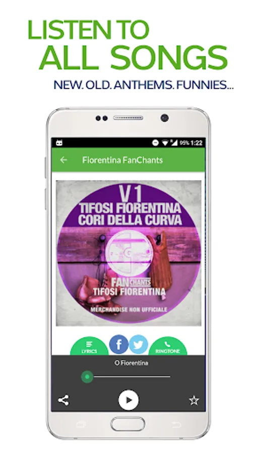 Real Fiorentina Fans football songs to play through speakers, send to mates and use as soccer ringtones for your smartphone. Receive alerts for new Viola Fans chants and use the in-built recording feature to submit new FanChants.