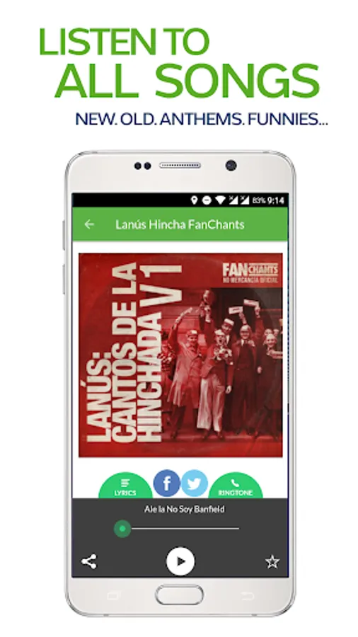 Real Lanus Fans football songs to play through speakers, send to mates and use as soccer ringtones for your smartphone. Receive alerts for new Lanus Fans chants and use the in-built recording feature to submit new FanChants.