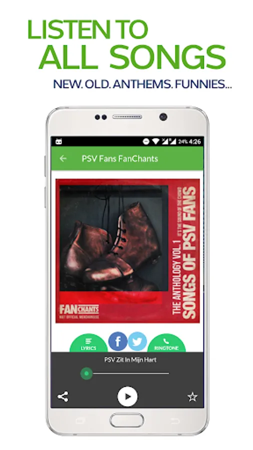 Real PSV Fans football songs to play through speakers, send to mates and use as soccer ringtones for your smartphone. Receive alerts for new PSV Eindhoven Fans chants and use the in-built recording feature to submit new FanChants.