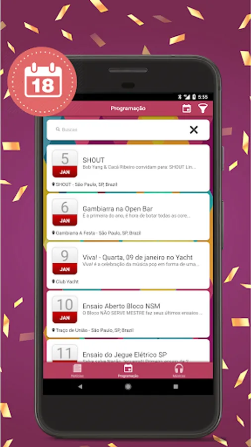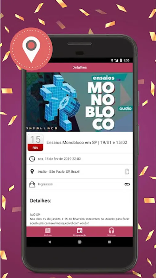 - All details about each event with constant update, including address, schedule and ticket purchase