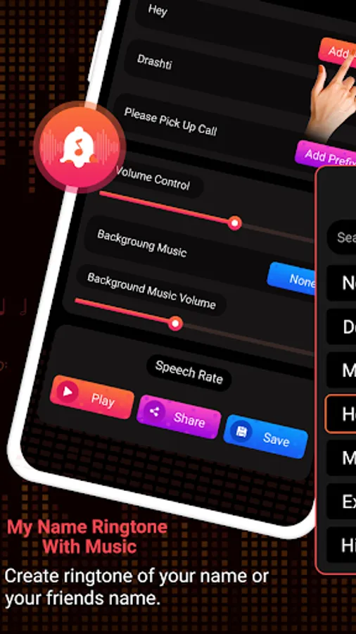 # Supported Man or Lady Voice Will speak your Name ringtone with selected Music.