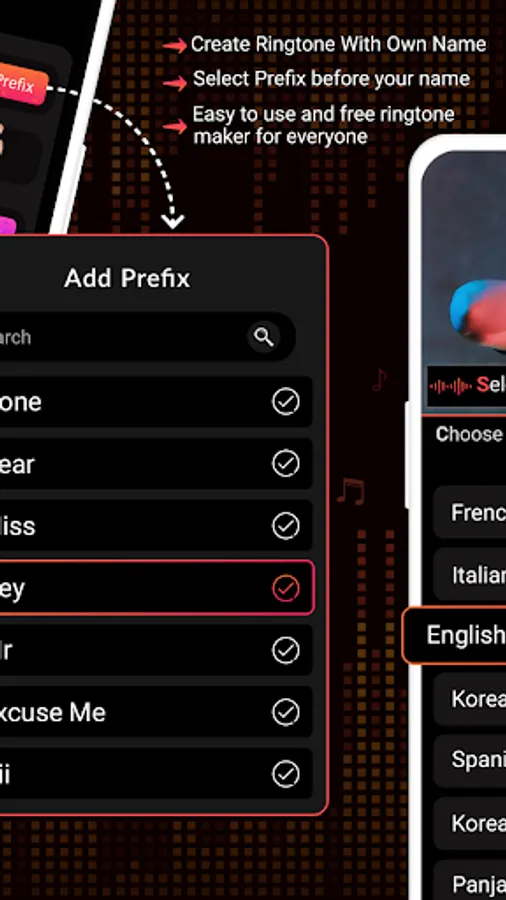 In this My Name Ringtone Maker : MP3 Ringtone Editor app you can easily create costume ringtone with music and your own name and some prefix.