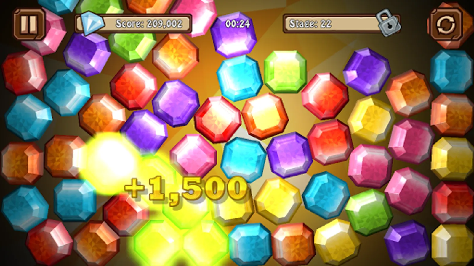 A towering jumble of gems fills the screen, taunting you with its chaotic mess of color. Swipe the screen to make like-colored groups of gems disappear. The more you match the more points you'll receive, so no matter how many gems are rattling around, just keep swiping!