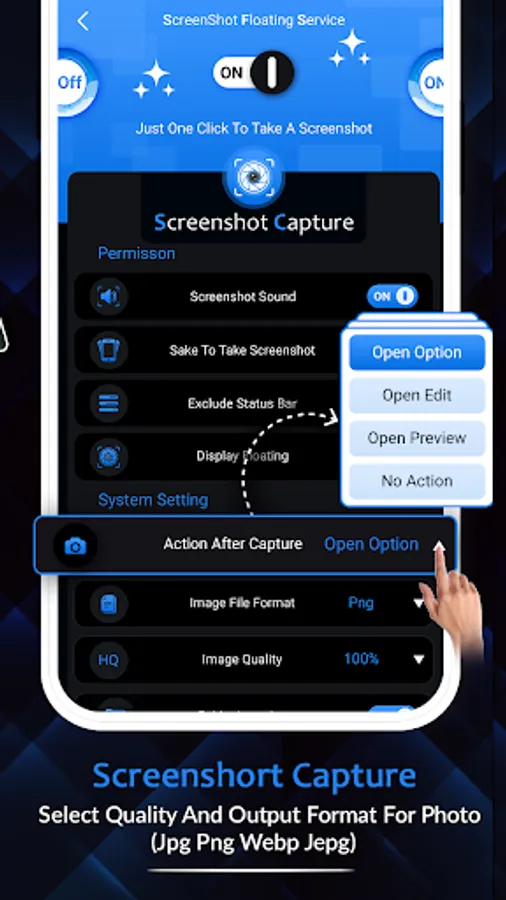 There is a "Floating button" to capture the screen. Floating button/gadget always remain on the top of the screen, so that you can capture easily at any time.