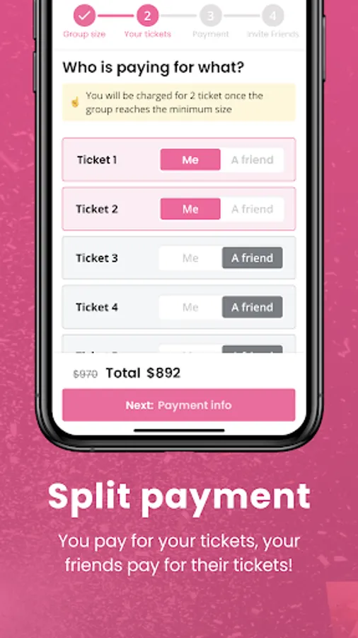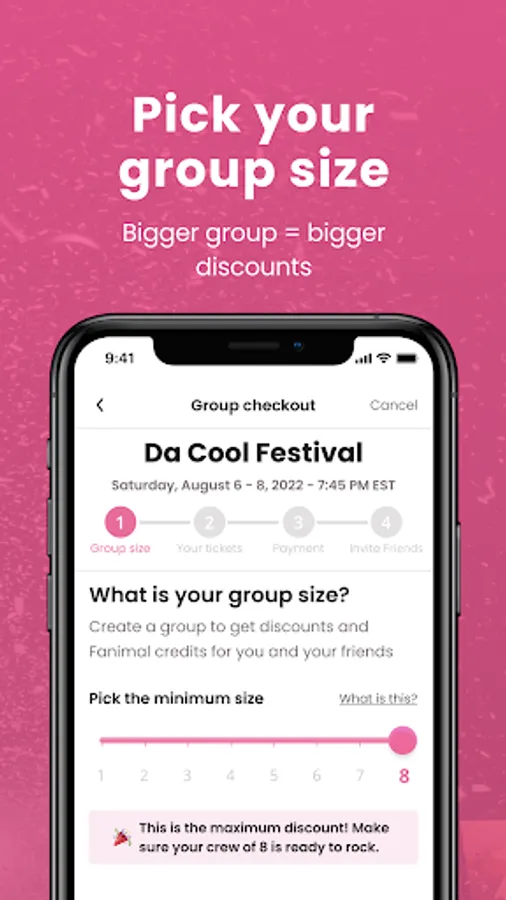 As a small team of live event lovers, we strive to bring our customers the best experience from start to finish, because memories like these can’t be repeated. This is why we’ve developed a proprietary group purchase feature, which allows users to pick an event, create a group, and invite their friends. Why is this feature so cool? You can reserve up to 8 tickets without the hassle of paying for everyone. Even better - the bigger your group, the bigger your savings!