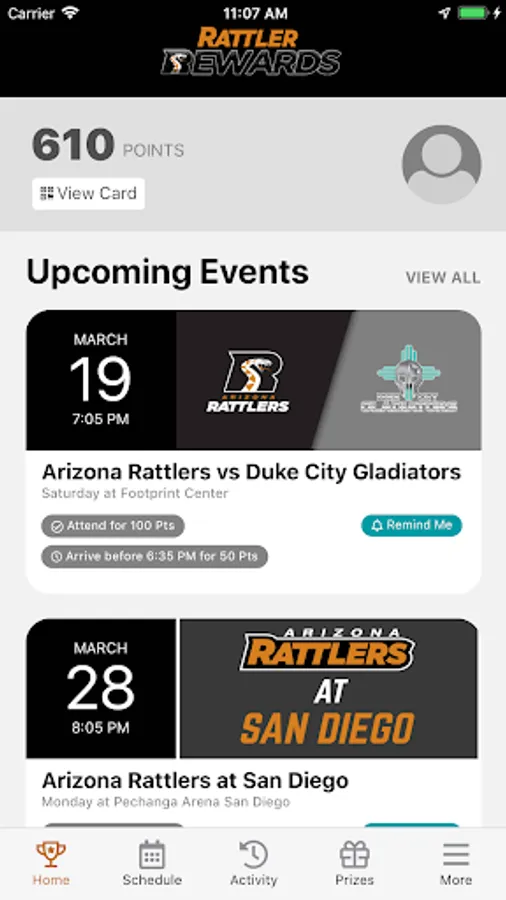 Rattle Rewards is the official rewards program for Arizona Rattlers! Go to events, earn points for attending, and use those points to redeem prizes and fan experiences at Rattlers' events. Joining is FREE and simple - Sign up with your email and opt-in to receive push notifications. By downloading Rattler Rewards, you'll also have access to mobile tickets as well as exclusive discounts and offers for local restaurants and retailers.