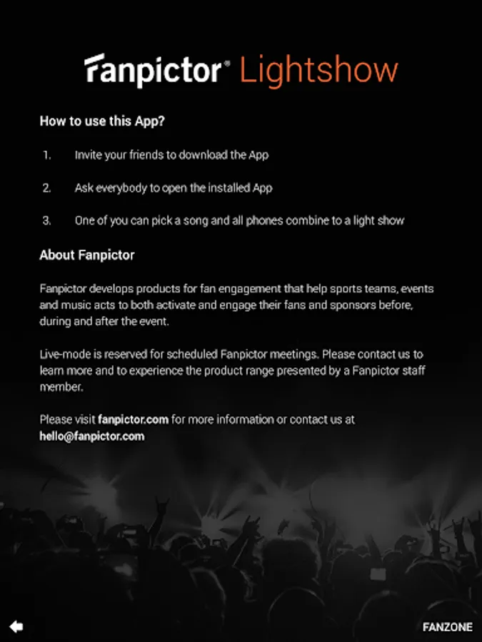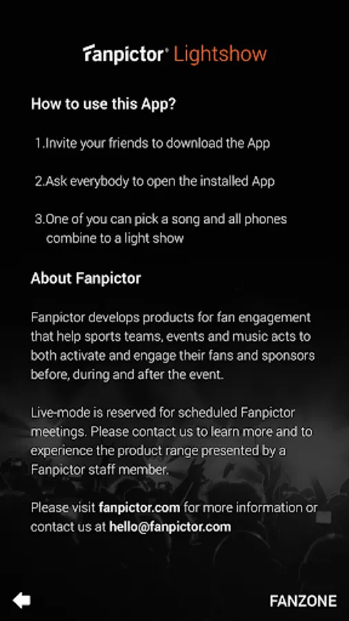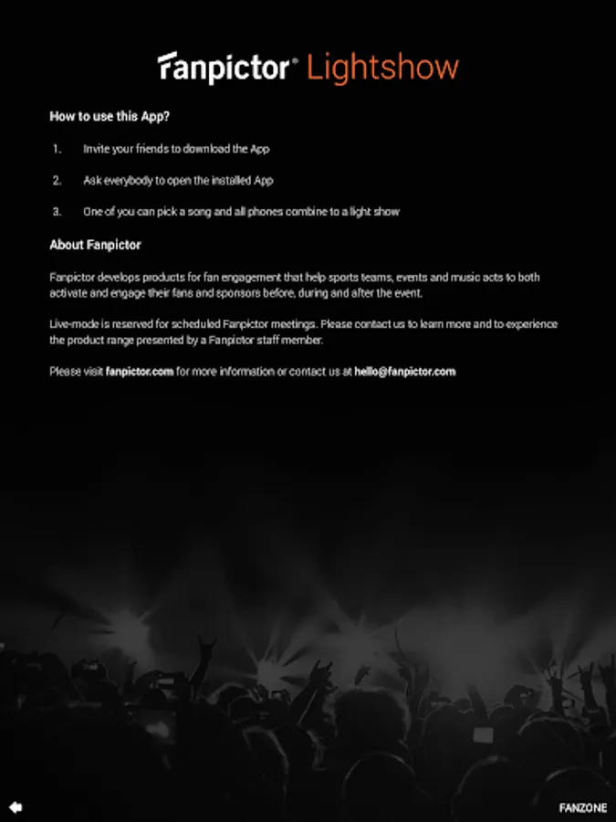 The Fanpictor App brightens your day! Install it on your and your friends’ phones and enjoy how all phones connect to a Lightshow!