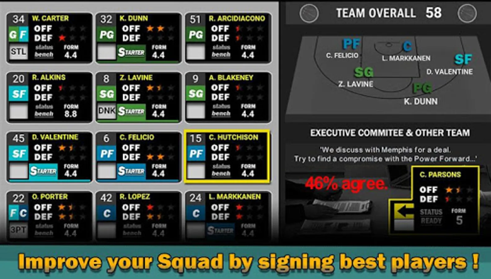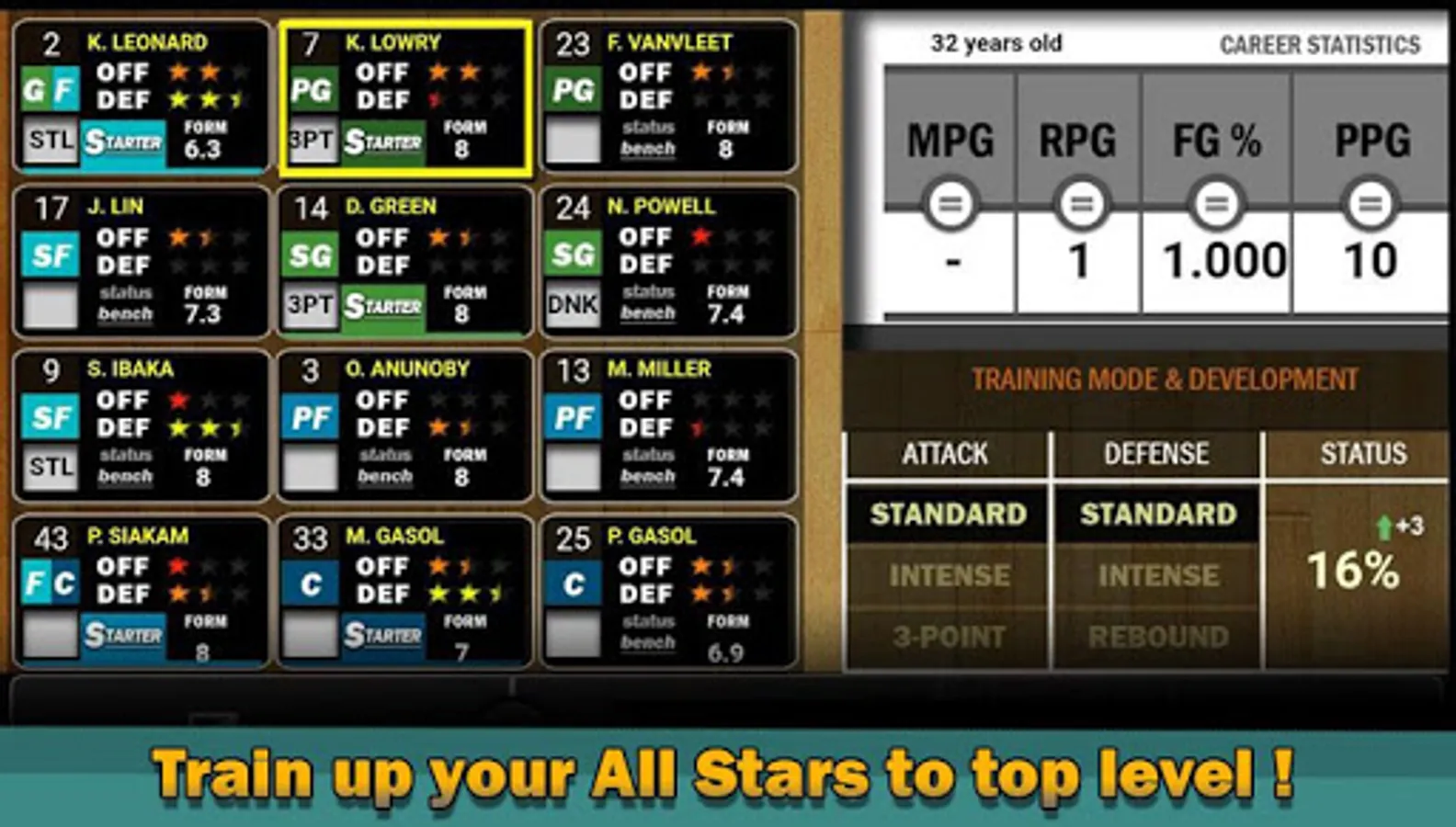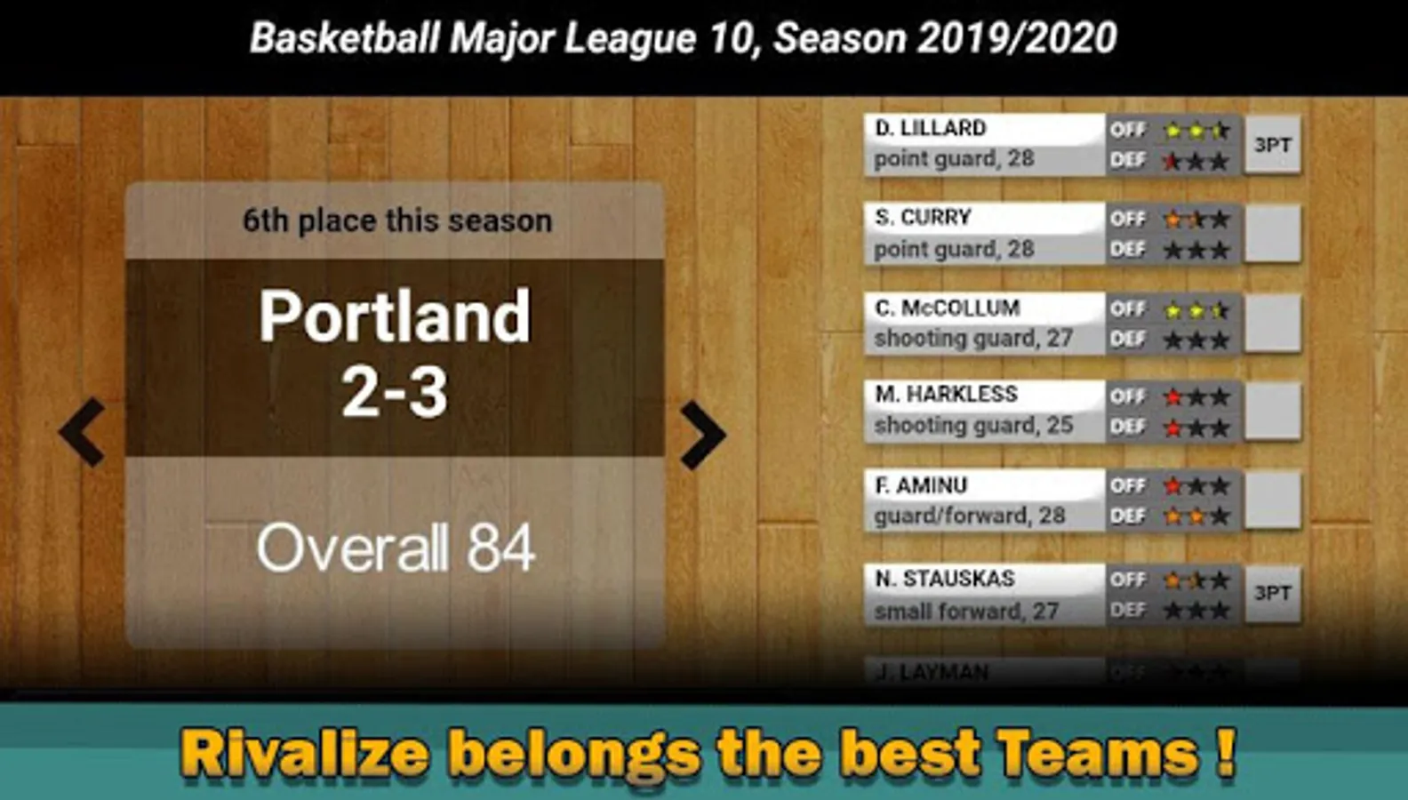 Train your best 5 starter, and find the balance between defense and attack. This game encourage the formation to the recruitment as in real life basketball!