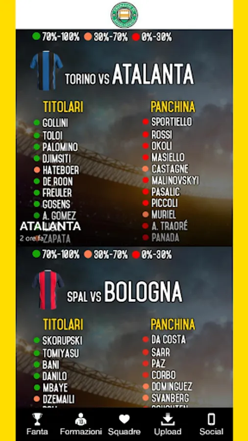 Lineups: all the probable lineups updated in real time according to the injuries, suspensions and physical condition of the players. Thanks to the percentages of our editorial staff you will be guided game after game in the creation of your training.