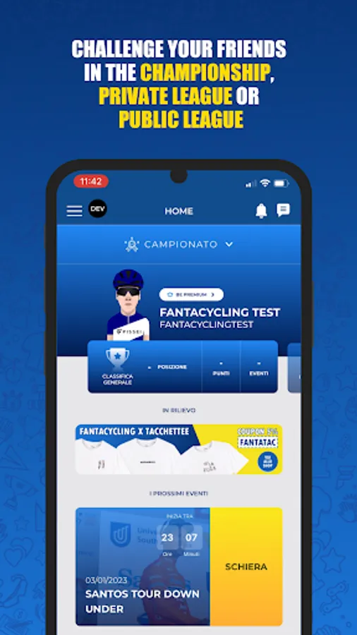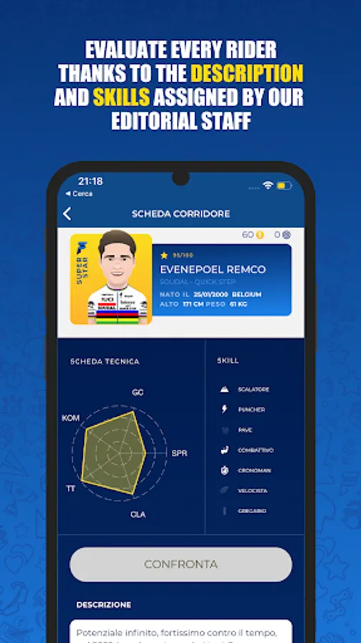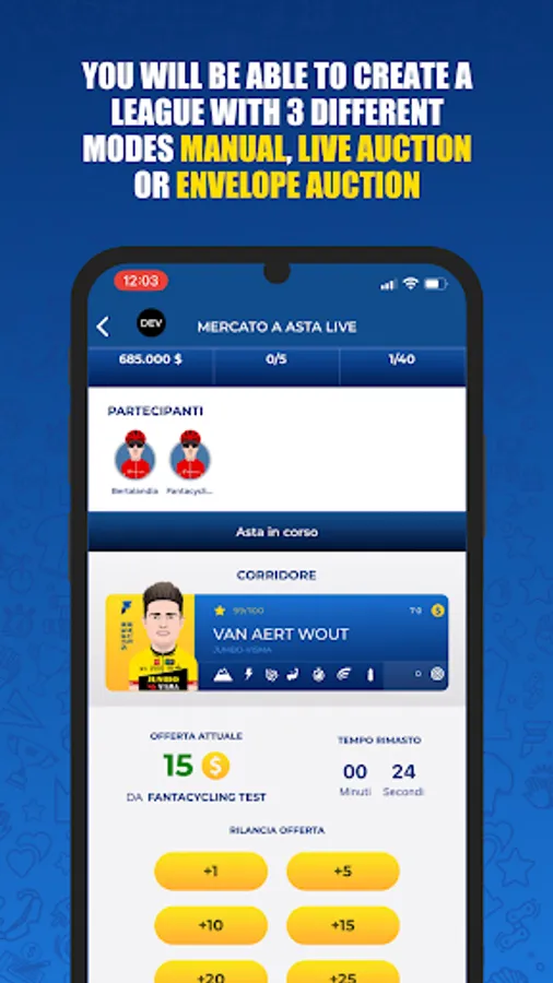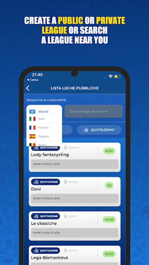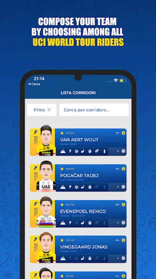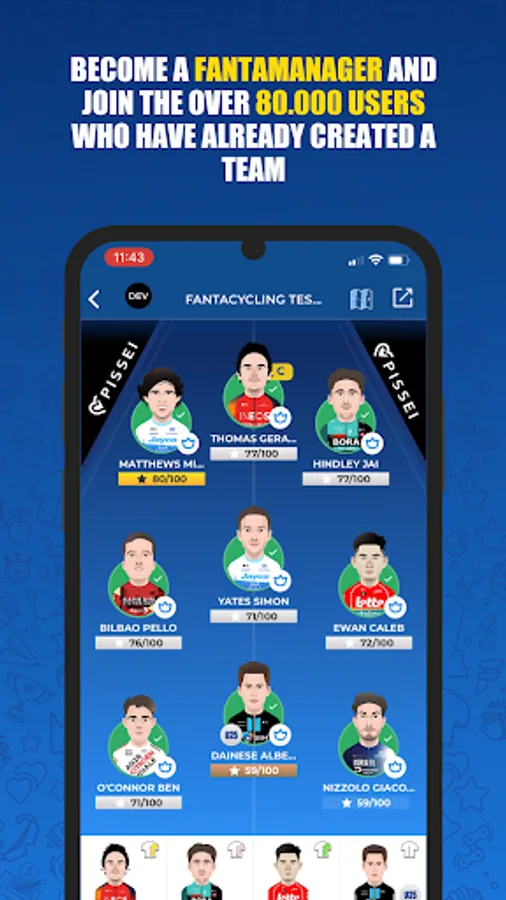 Compete in a LEAGUE with your fanta-friends. You will be able to invite as many friends as you want to your league. Customize the scoring rules and the competition calendar and make your fantacycling unique. You can create teams with your friends with the offline auction methods , envelope auction or through the listing proposed by our staff.