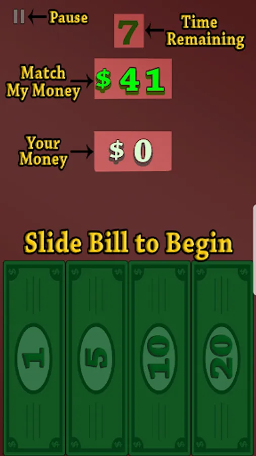 Race against the 7-second clock to quickly match my money. Be careful not to go too fast because you can't take back what you give. How much money can you match?