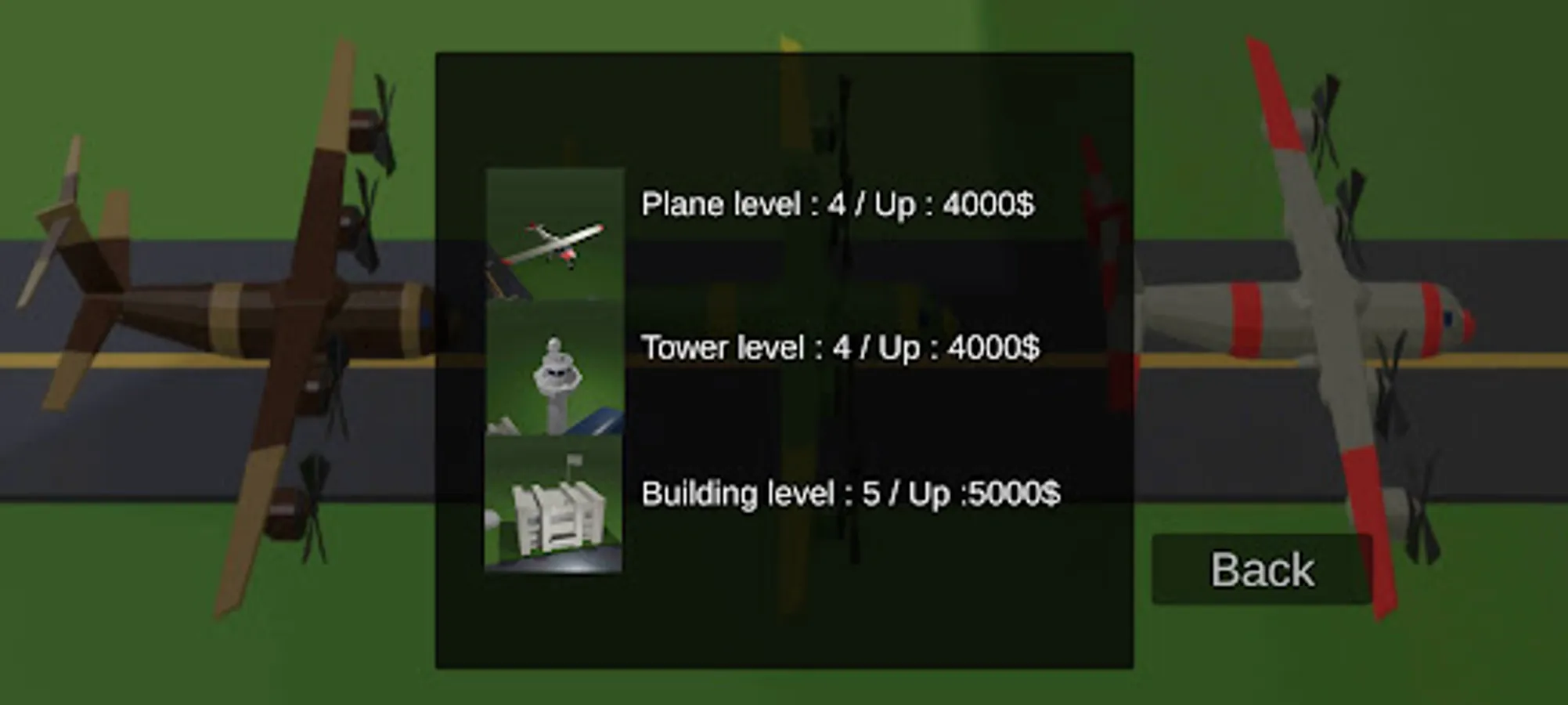 The game has no ads or in-app purchases. You can download the game and play with peace of mind. You will not encounter annoying things in the game. In the game you can improve the plane, the main building and the tower. This is the main aim of the game.