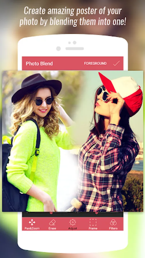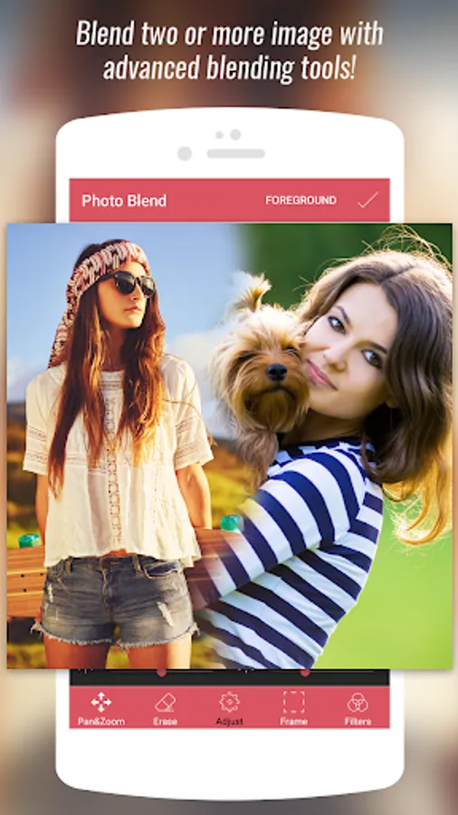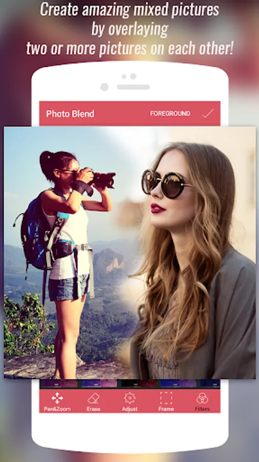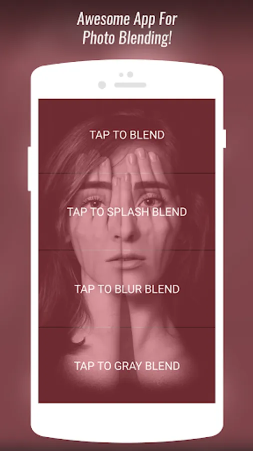 Photo Blender Superimpose blends two of your images into a single image. Create an amazing poster of your photo by blending them into one, which is so fantastic. Blend two images of different sizes quickly, using blend-fade.