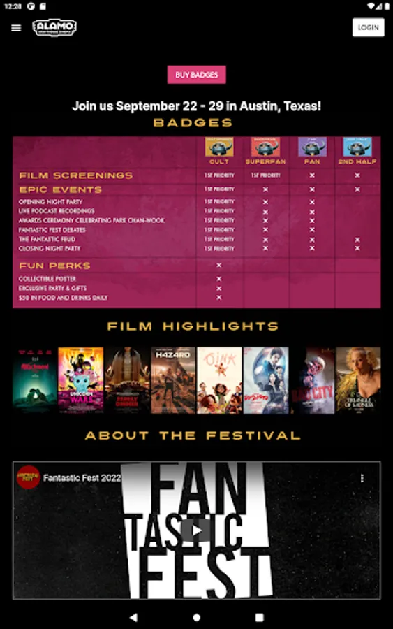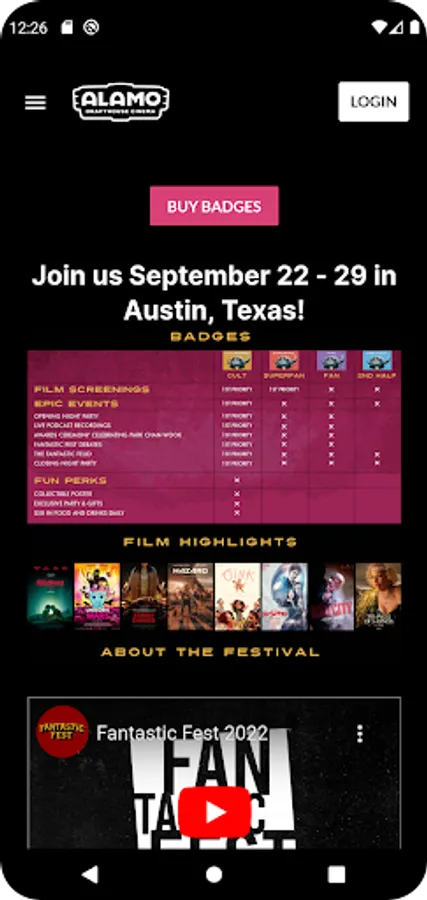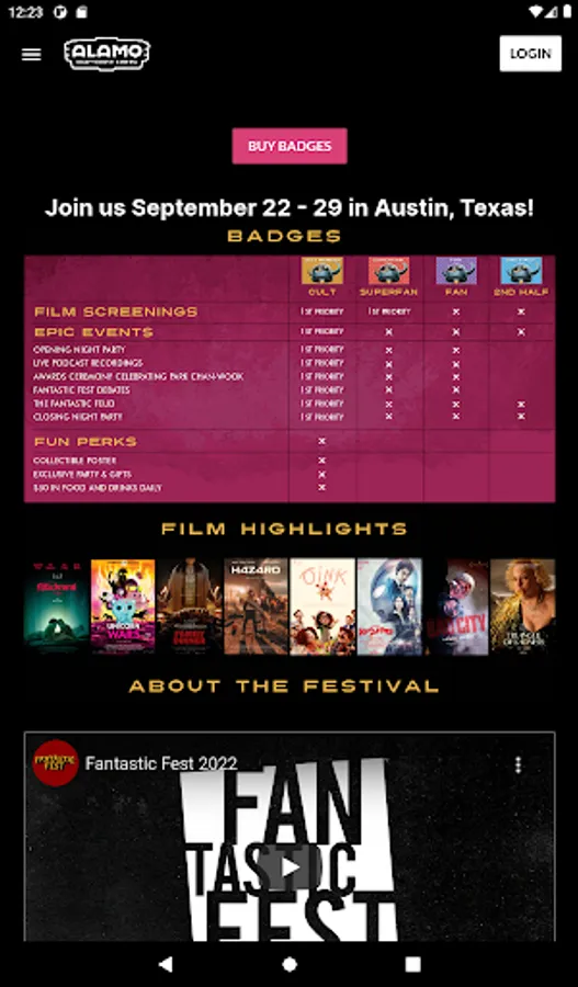 This is the official app for Alamo Drafthouse's Fantastic Fest. You can use this app to make ticket selections, check your schedule, view the Festival Program Guide, and vote for your favorite films. You can also use it to pull up tickets and your badge ID for scanning at the theater door.