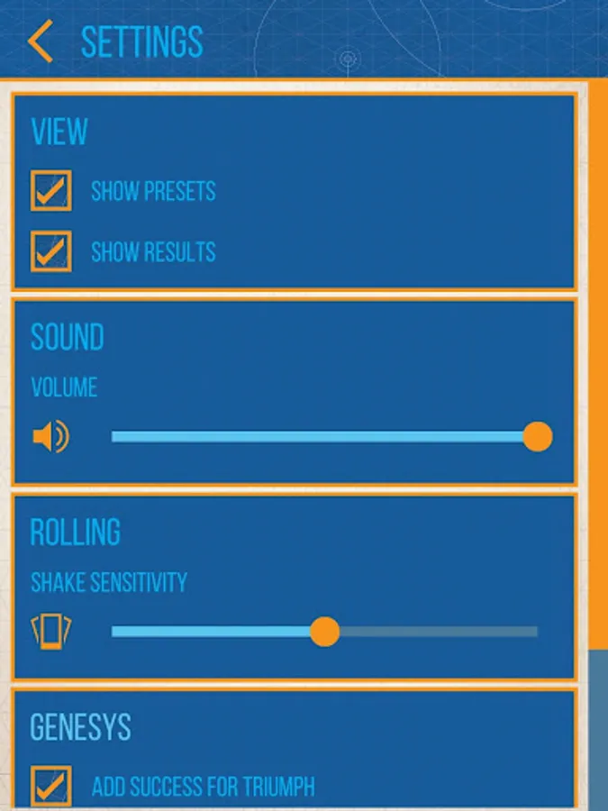 •A suite of settings to toggle visibility of die results, presets, audio controls and shake sensitivity.