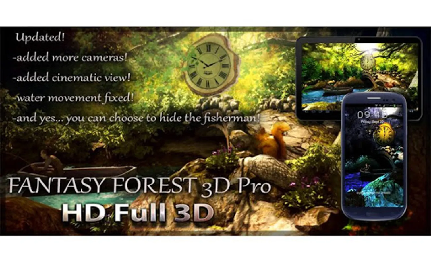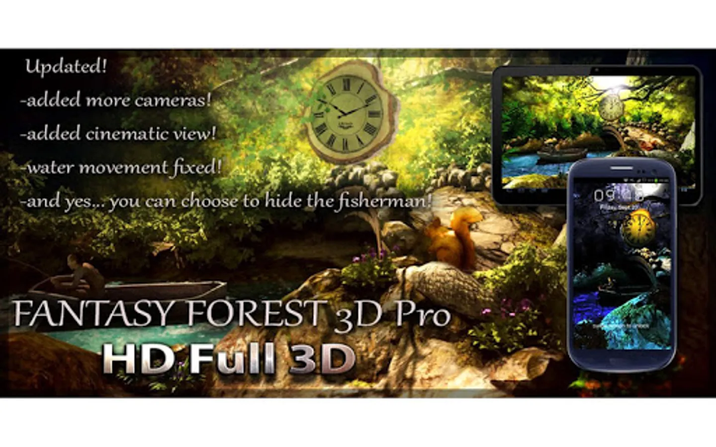 The most beautiful 3D live wallpaper on Google Play for your phone or tablet! Fantasy Forest 3d Pro delivers everything what you ever wanted from live wallpaper! Amazing colorful forest environment with lot of details will give your phone spectacular look! You do not need anymore clock widget on your phone, beautiful fantasy clock placed in the scene always will keep you informed about what time is now!