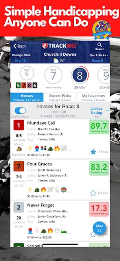 TrackWiz is bringing a new, young, tech-savvy audience to the race track. Our patent-pending algorithms take into account over 100 different attributes to create a unique TrackWiz rating and story for each horse, empowering users to place bets with a whole new level of confidence!