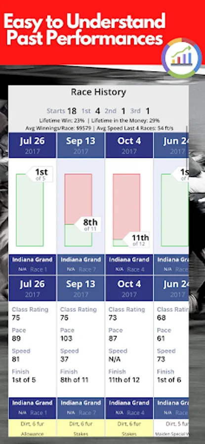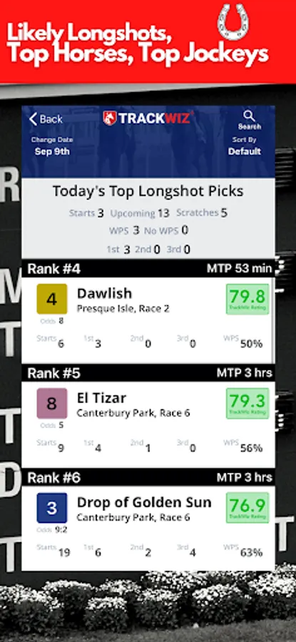 · TrackWiz Rating – TrackWiz’s proprietary algorithm helps you quickly identify what's going on with the horse and its connections.