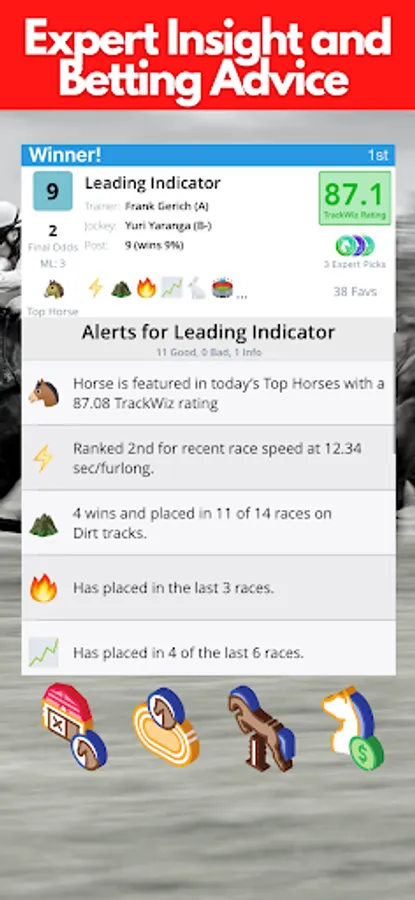 · Alerts – Is the horse using Lasix for the first time? Blinkers? Does this horse crush at this post? Receive 100+ different types of relevant alerts.