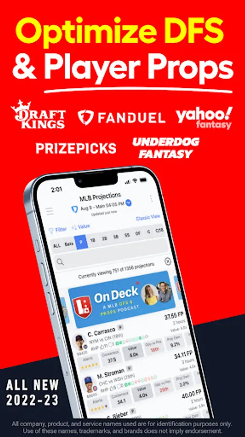 ALL-NEW 2023 SEASON! Fast optimize 150+ lineups for DraftKings, FanDuel, or Yahoo! Import/Export directly to DFS operators. Late swap missing players. Player Props, Injury Status, Starting Lineups, Value Plays, Matchups + More.
