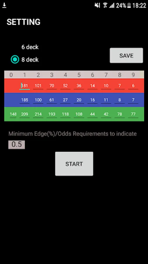 This app instantly calculates and displays the edge that has occurred for each point bet with the current remaining cards.