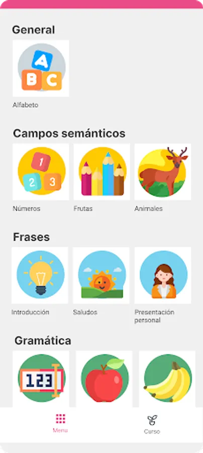 This app organizes its content in semantic fields, and you can learn this content in 3 ways, flashcards, material and educational videos.