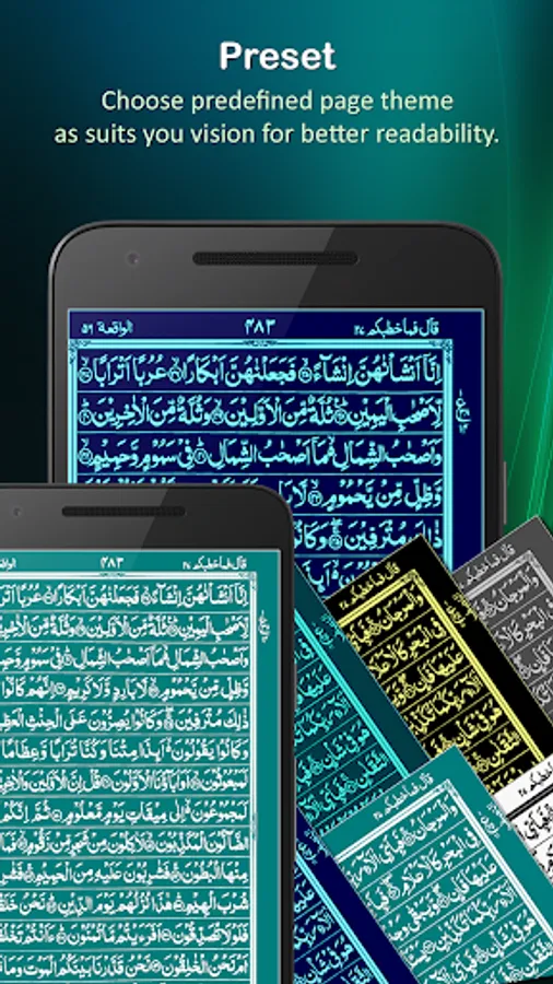 Page preset gives you a totally changed look of Quran pages with beautiful combination of colored background and text. You can choose any preset among given five presets from settings.