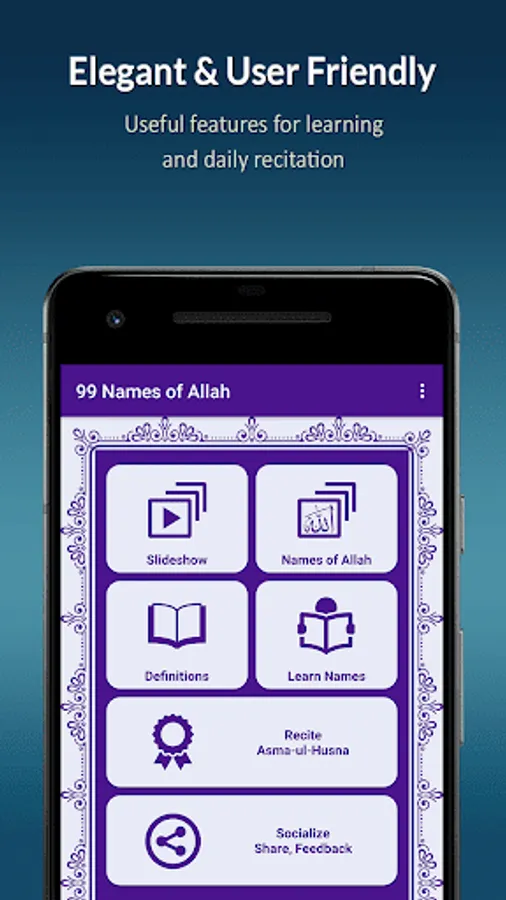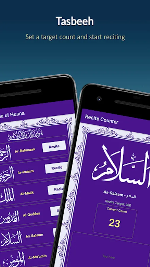 Each name of Allah has its own benefits of recitation. You can use this app as a tasbih (counter). Select any name, set a target count and start reciting.