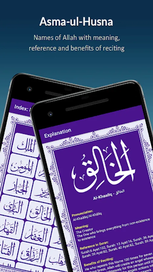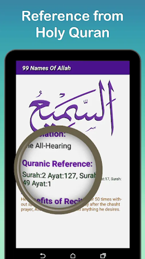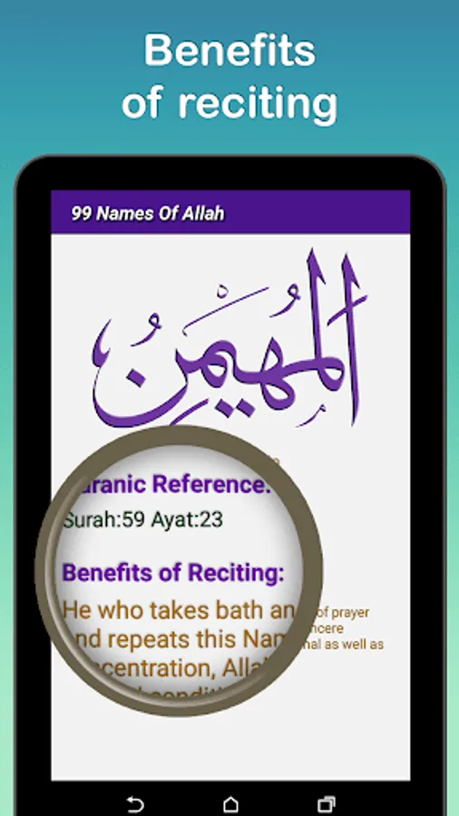 Explains each Names of Allah with meaning, definition, quranic reference and benefits of recitation.