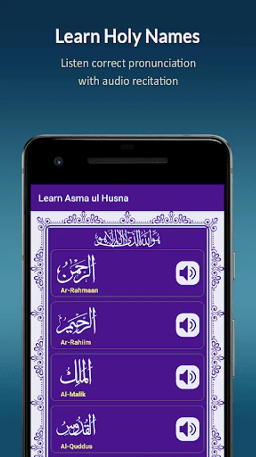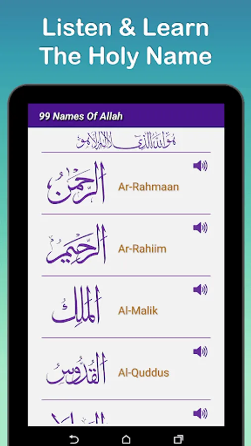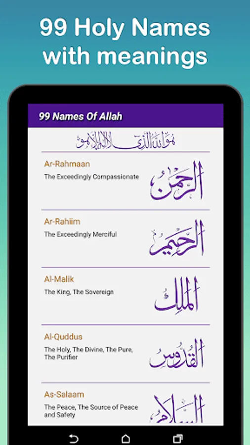 Read, listen and learn the beautiful 99 names of Allah Almighty. You can learn all these Names with correct pronunciation, its meaning and benefits on daily reciting these names. Gather the spiritual blessings, happiness, peace of mind and solve your problems by reciting these Holy Names daily.