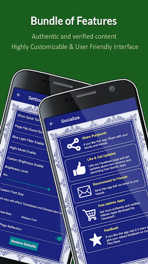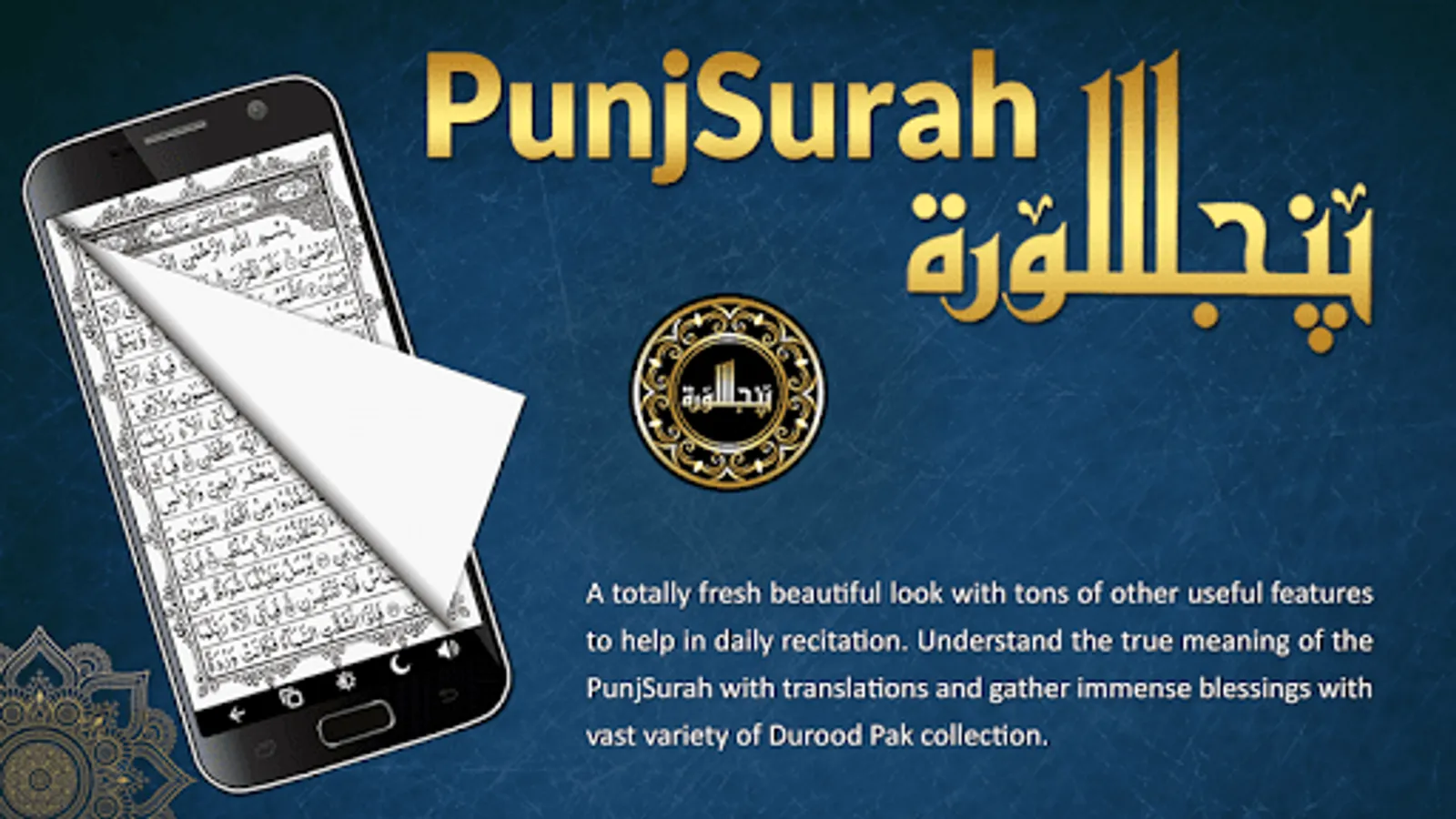 A totally fresh beautiful look with tons of other useful features to help in daily recitation. Understand the true meaning of the PunjSurah with translations feature and gather immense blessings with vast variety of Durood Pak collection.