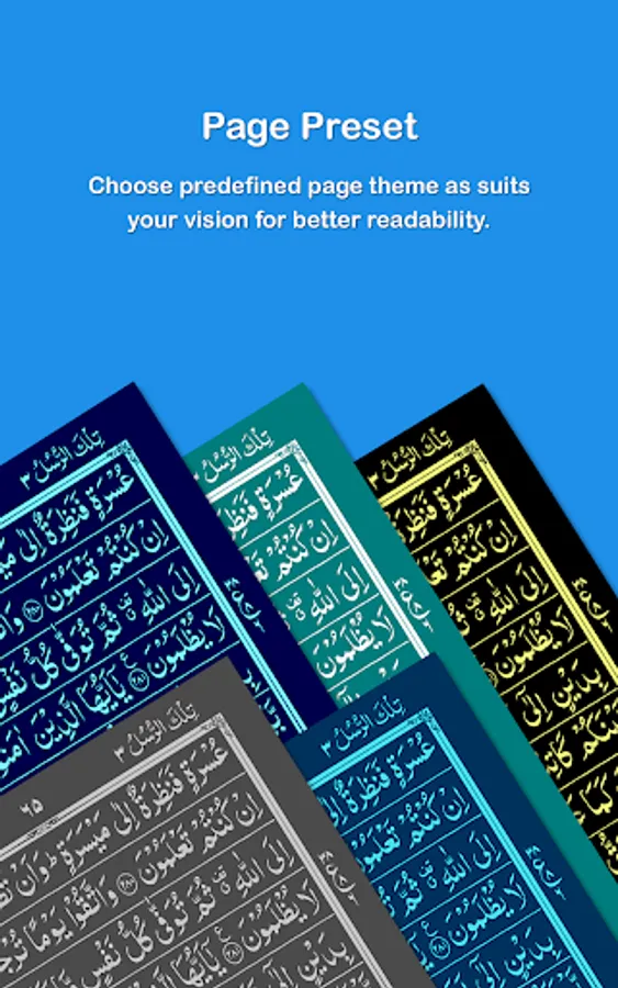 Page preset gives you a totally changed look of Quran pages with beautiful combination of colored background and text. You can choose any preset among given five presets from settings.