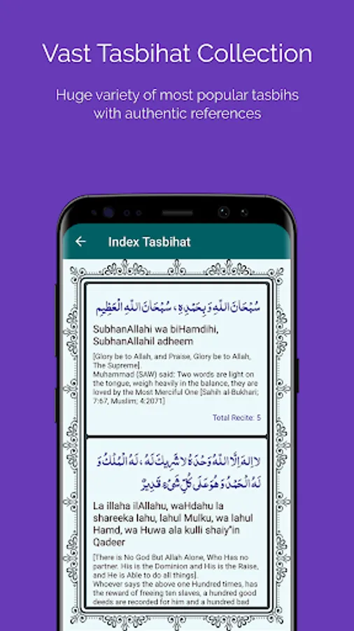 Index Tasbihat contains a wide variety of tasbihs with authentic reference of Quran and Hadith. All built-in tasbihat have also translation and transliteration of pronunciation to help users to understand and recite better. You can just select anyone by a single tap.