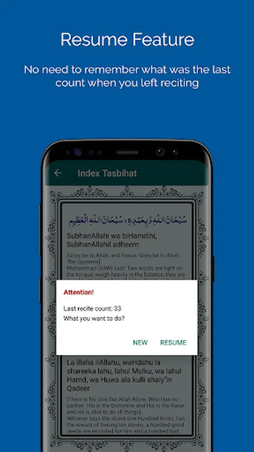 A simple but powerful feature which saves a lot of time and makes your reciting routine very easy. It will automatically remember the last progress of your tasbih which you left before exiting the app.