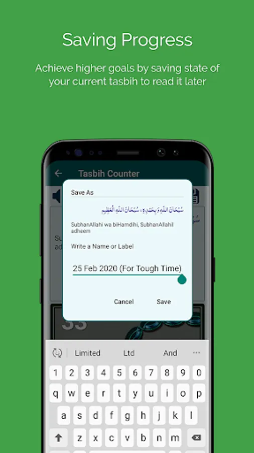Tasbih now comes with a saving feature by which you can save progress of your current tasbih by tapping on save icon from quick toolbar. It will store this progress into saved tasbihat list so you can read it anytime later.