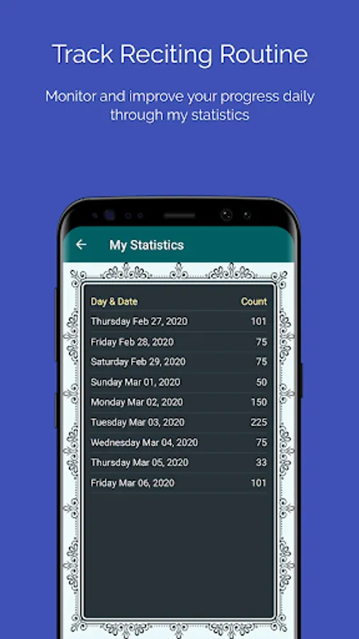 Improve your routine of recitation by monitoring your daily progress and history of recitation in my statistics section. The main home screen has also a summary of your reciting into today, total count and date when you recite the last time.