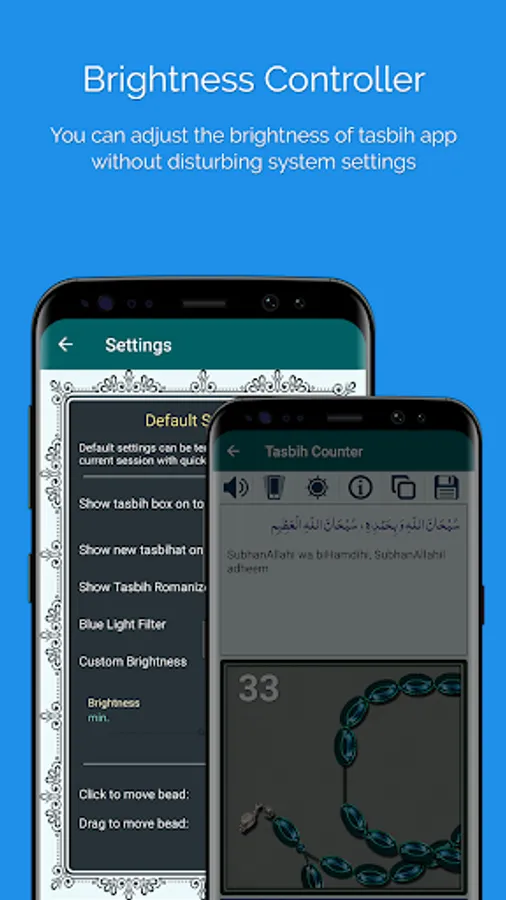 Now the quick toolbar came loaded with more useful features sound, vibration, custom brightness, bluelight filter and ultimate save button to save progress of the current tasbih.