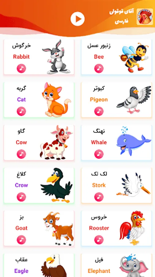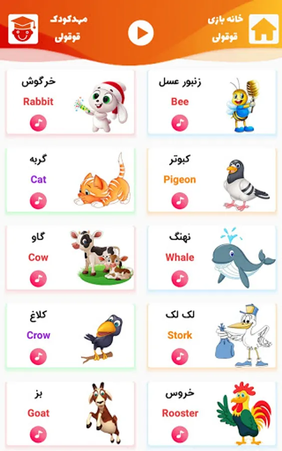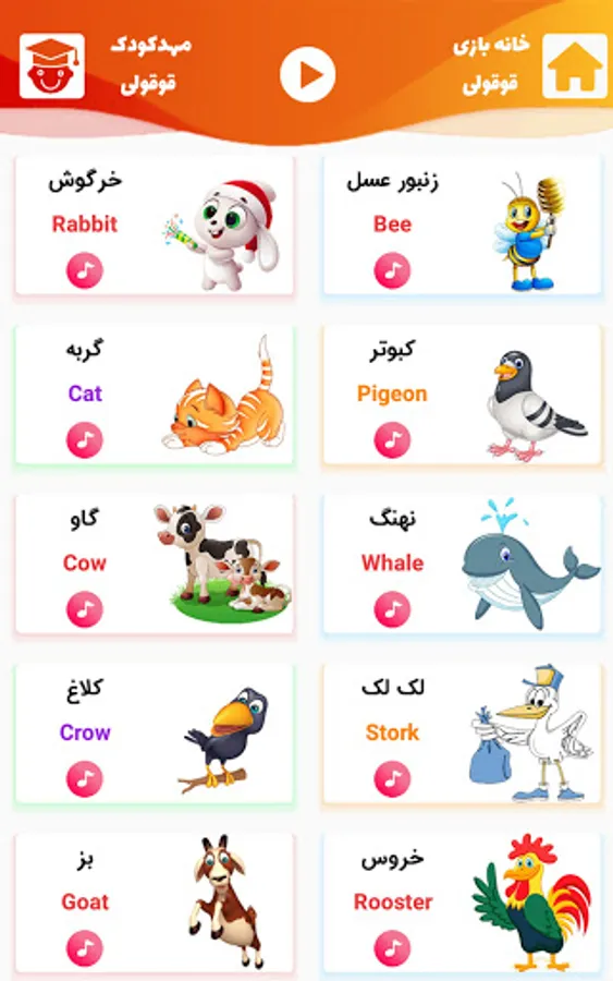 In this application, while teaching the sounds of animals, happy songs in English and attractive games and entertainment are presented so that your child's precious time is spent on the development of his talents.