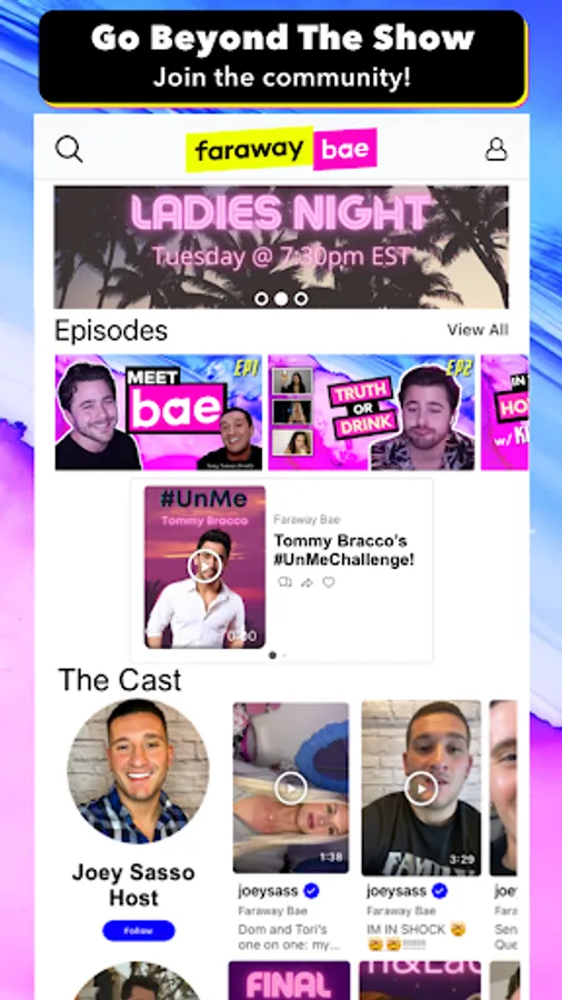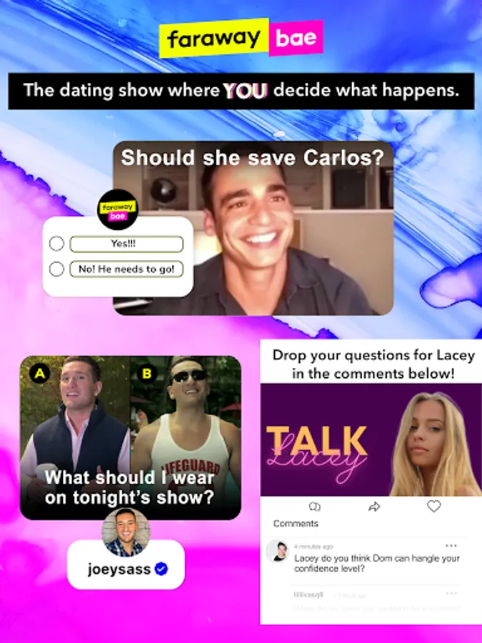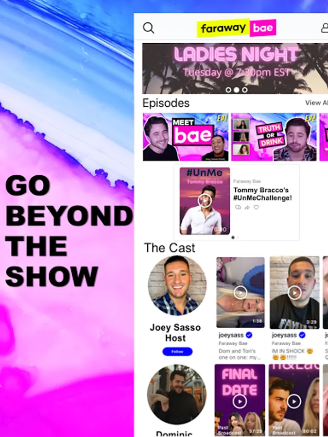 Joey Sasso hosts Faraway Bae, the live dating show where you decide what happens next! Download the free app to interact with the cast in between episodes, vote on the direction of the show, watch the live streamed dates & more!