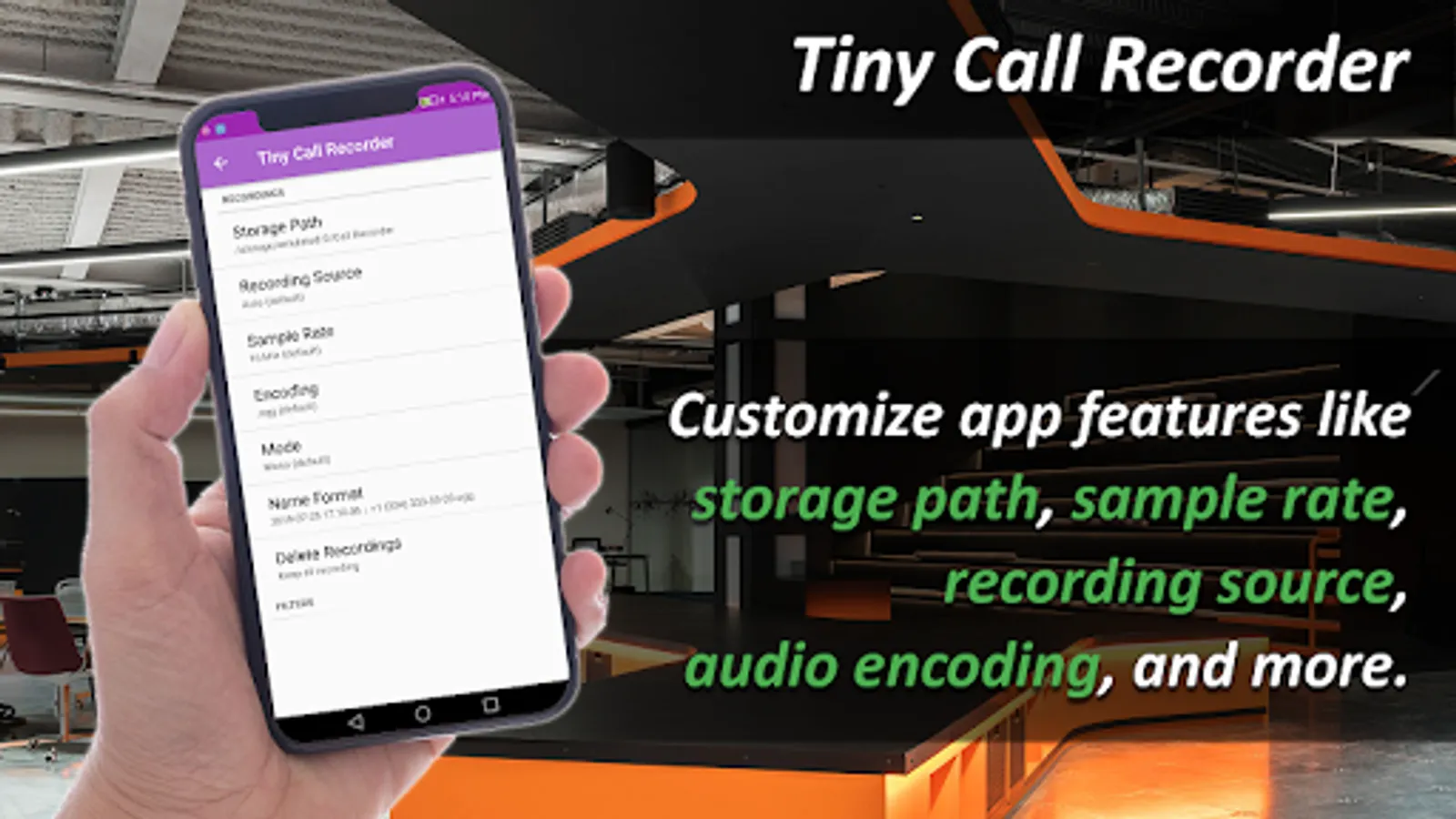 Tiny Call Recorder allows you to automatically record incoming and outgoing audio calls. The app runs in the background and is optimized to consume minimal battery. Battery optimization feature is available in Settings menu.